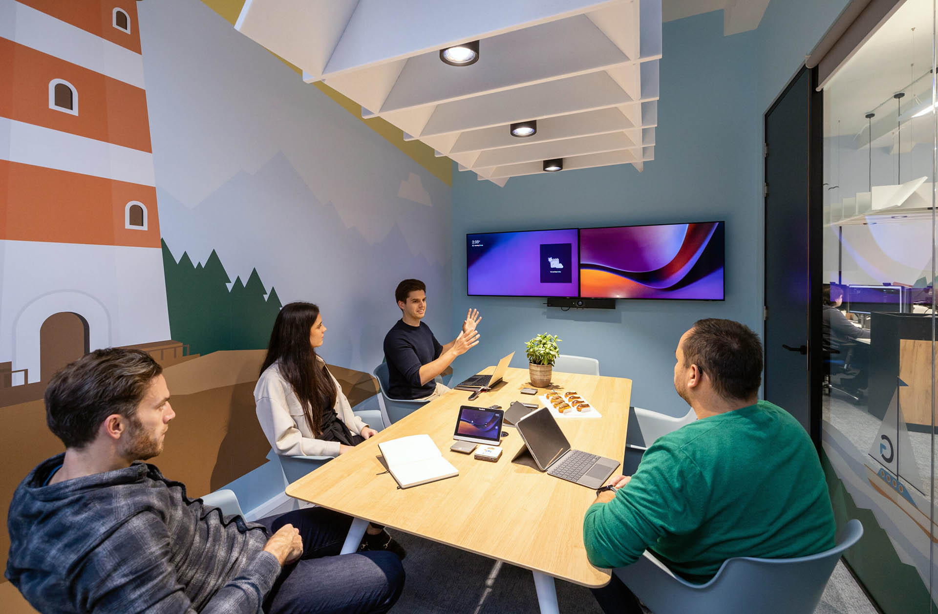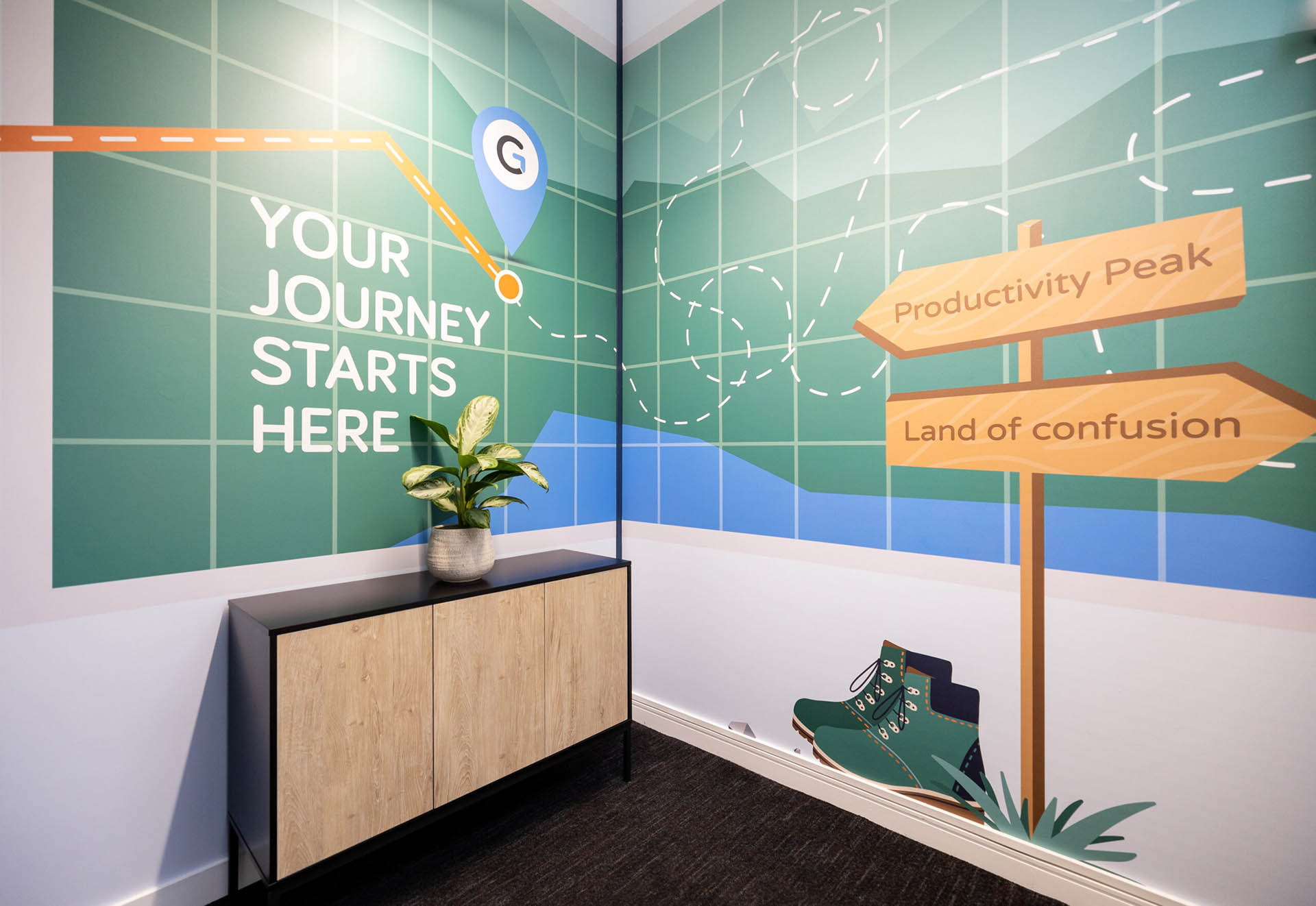 Walls were the primary canvas to narrate the story of a client journey with Computer Geeks. By using modern and bold colours, classic 8-bit characters, natural biophilic elements an engaging atmosphere was created. The new office features contemporary furniture which provides a comfortable setting whilst separating the different work zones. The use of best in class technology promoted greater synergy with clients and colleagues working away from the office