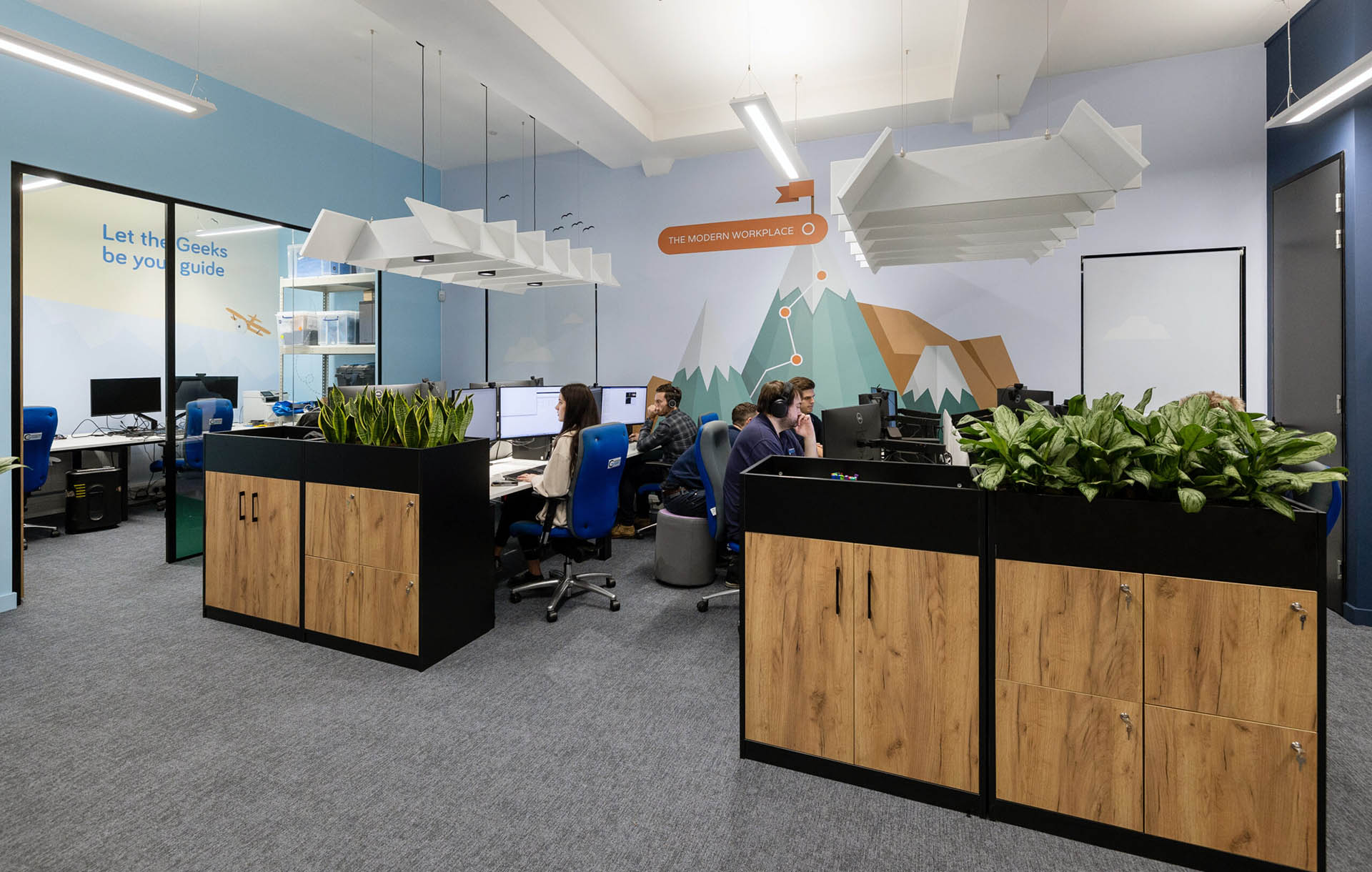 Computer Geeks decided to refurbish their office in order to enhance their brand image and create a workspace reflecting best practice. The primary objective of the renovation was to create an environment that reflected the journey of providing IT support to clients, from start to finish. To achieve this, the company aimed to create a space that was both productive and playful whilst promoting their brand, culture and showcasing the latest technology. We designed a variety of layout options that challenged the brief and understood the integral day to day tasks of the team, ensuring the correct workplace settings were created