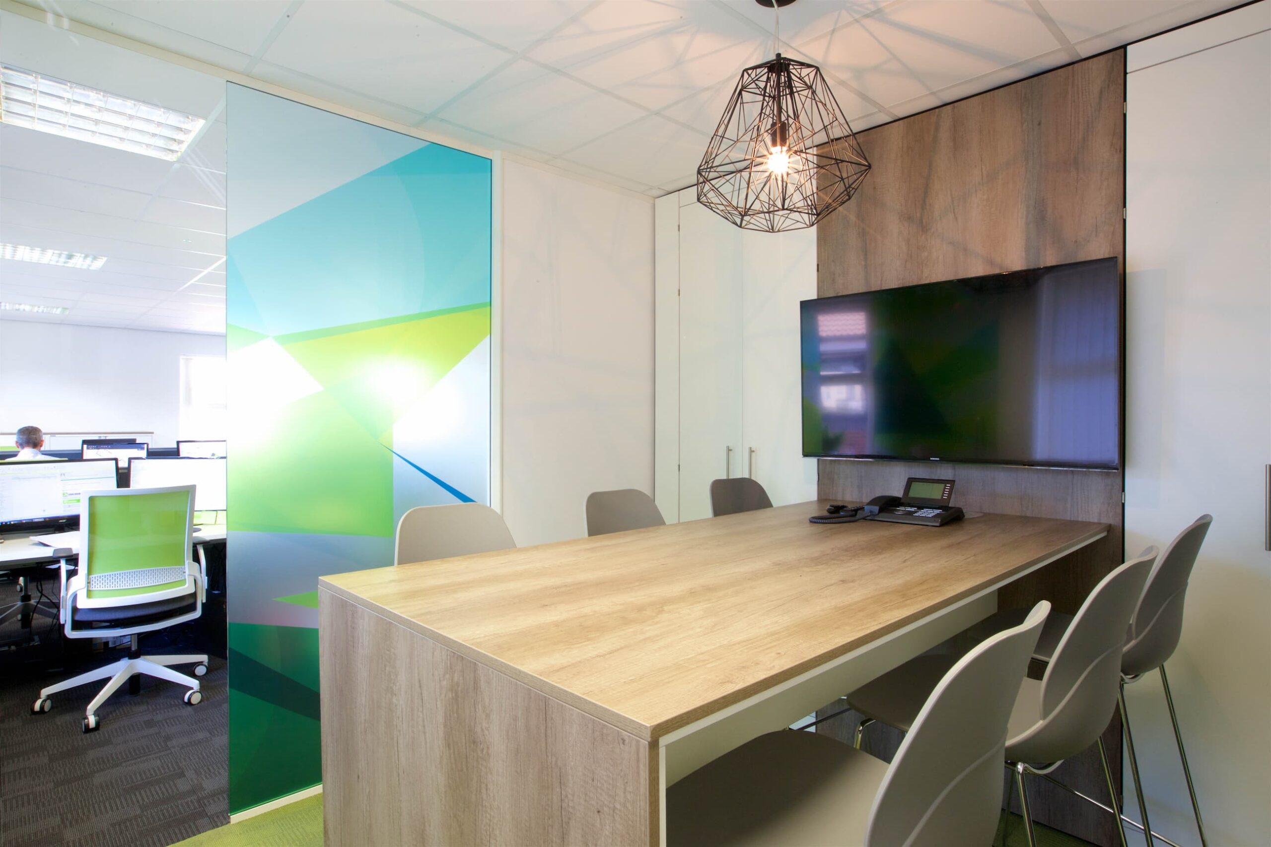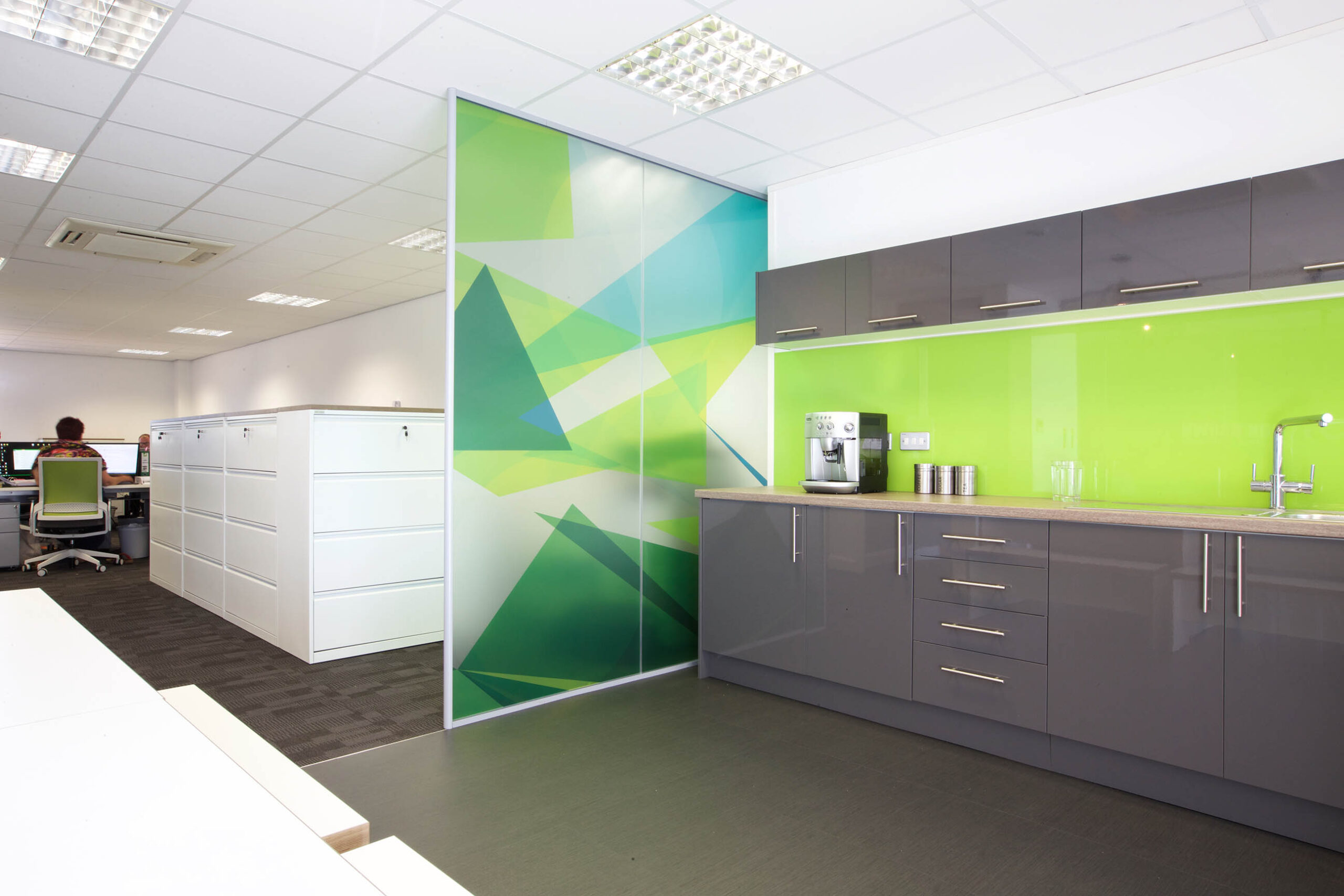 The new design at its core provided a desking layout that improved the communication between departments and project teams. From this we created collaborative spaces that were flexible, inviting and connected. The spaces were formed utilising the bespoke storage unit meaning the need for new partitioning was reduced. This area also formed an admin hub for the office. AMH created a vibrant look using the clients corporate colours. We combined these colours with striking graphics to the new solid partitions and existing glazed partitions. The clean, fresh look of the new furniture was enhanced with a warm timber effect to storage units