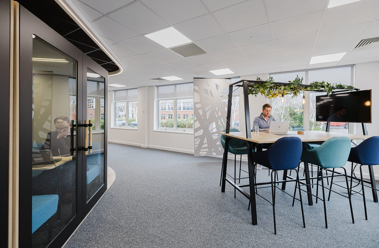 The finished workspace gives the team everything they need for how they work today and how they’ll work in the future. Dedicated focus areas for heads-down tasks sit alongside quieter zones for confidential conversations. A central breakout space has become the heart of the office: relaxed, social and easy to drop into. High huddle tables, private booths and enclosed meeting rooms offer further choice depending on how people want to work.